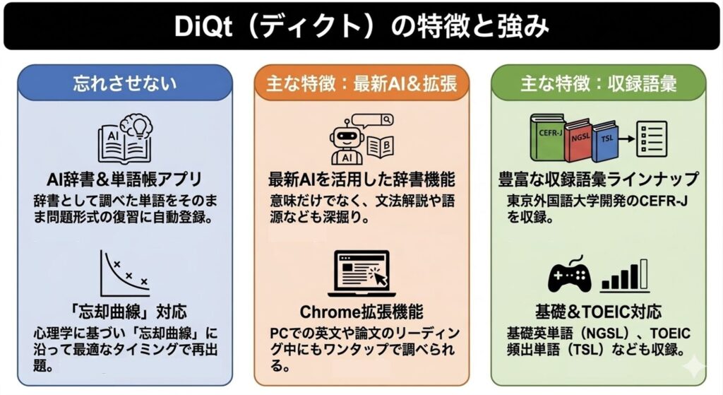 DiQtは、「調べた英単語を絶対に忘れたくない人向け」のAI辞書&単語帳アプリです。