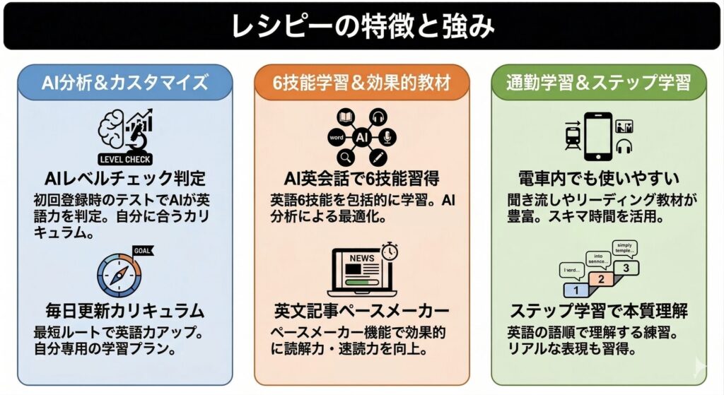 レシピーは、「自分に合った英語学習を続けたい人向け」のAI英会話アプリです。
