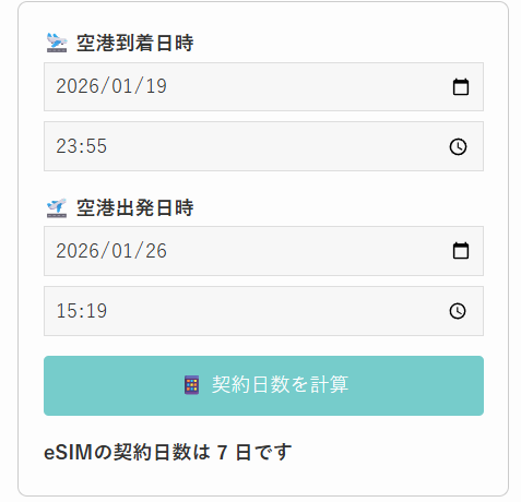 使い方はとっても簡単で、eSIMを使い始める現地の到着時間と、出国する時間を選ぶだけで、必要な日数がすぐにわかるんです。