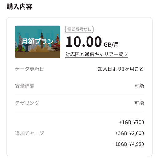 トリファの月額プランは、世界116カ国対応の10GB/月プランのみとシンプルな構成です。10GBは、一般的な使い方であれば十分な容量です。