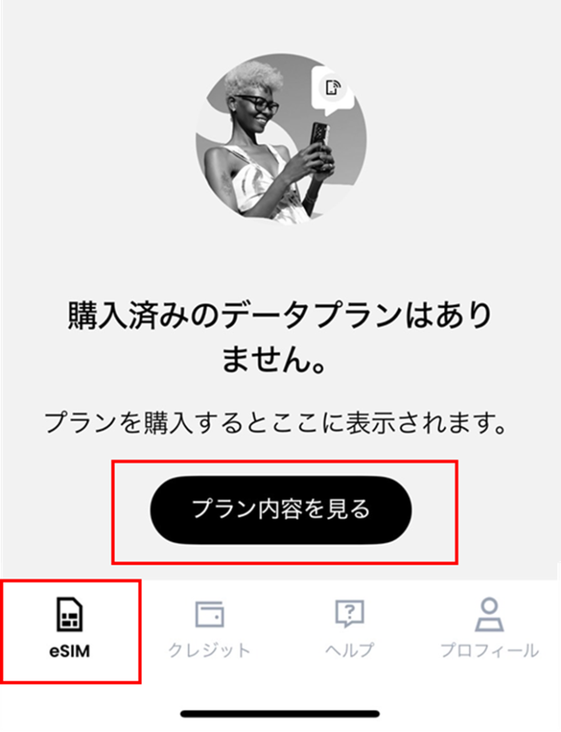 Sailyのアプリを開いてeSIMのタブにあるプラン内容を見るを選択します。