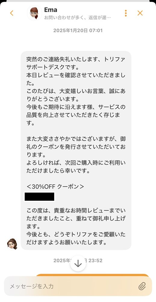 実は私自身、2025年冬にHolaflyアプリでレビューを投稿した際、30%OFFクーポンを受け取った経験があります。