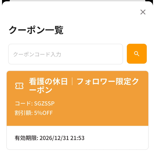 そう思って探している方も多いですが、現在利用可能なクーポンコードは5%OFFの友達紹介コードのみです。