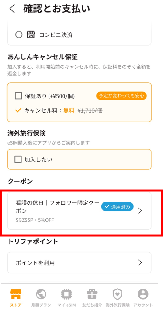 トリファeSIMのクーポンは、初めての人だけじゃなく、リピーターの人も使えるんです。対象は、トリファeSIMのアプリから海外用eSIMを購入する場合。