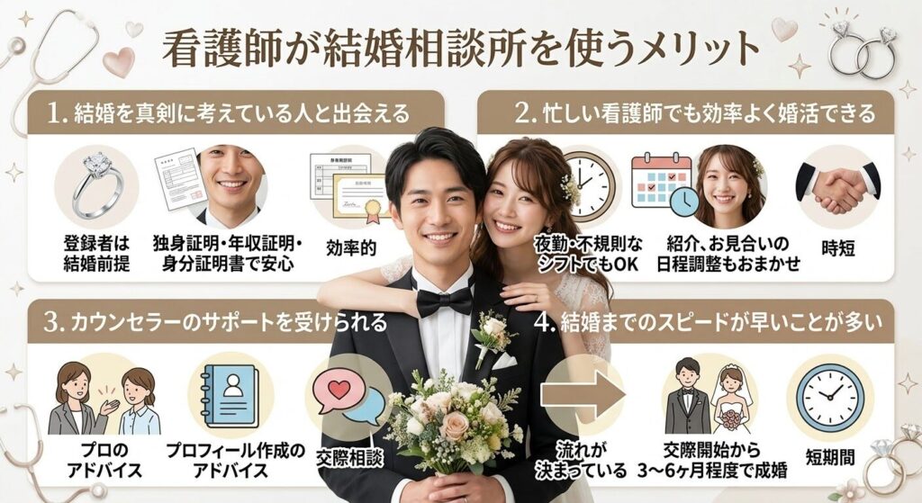 そんな看護師にとって、結婚相談所は効率よく結婚相手を探せる方法の一つです。ここでは、看護師が結婚相談所を利用するメリットを紹介します。